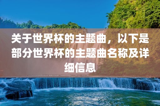摘要:,,本文介绍了世界杯的部分主题曲名称及详细信息。这些主题曲是世界杯的重要组成部分,为比赛增添了激情和氛围。每首歌曲都有其独特的风格和旋律,反映了世界杯的精神和氛围。通过本文,读者可以了解世界杯主题曲的历史和相关信息。