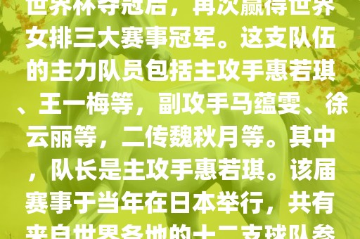 在2011年日本女排世界杯赛中,中国女排以全胜战绩摘得冠军,这也是中国女排继1995年世界杯夺冠后,再次赢得世界女排三大赛事冠军。这支队伍的主力队员包括主攻手惠若琪、王一梅等,副攻手马蕴雯、徐云丽等,二传魏秋月等。其中,队长是主攻手惠若琪。该届赛事于当年在日本举行,共有来自世界各地的十二支球队参与角逐。此外,该届世界杯的最佳发球奖由日本名将木村纱织获得。