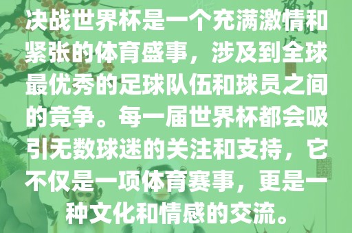 决战世界杯是一个充满激情和紧张的体育盛事,涉及到全球最优秀的足球队伍和球员之间的竞争。每一届世界杯都会吸引无数球迷的关注和支持,它不仅是一项体育赛事,更是一种文化和情感的交流。