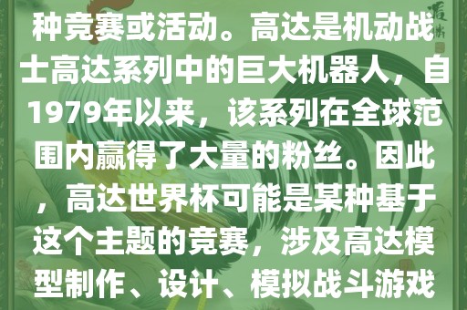 高达世界杯,通常指的是与高达这个知名动画系列相关的某种竞赛或活动。高达是机动战士高达系列中的巨大机器人,自1979年以来,该系列在全球范围内赢得了大量的粉丝。因此,高达世界杯可能是某种基于这个主题的竞赛,涉及高达模型制作、设计、模拟战斗游戏或与高达主题相关的其他活动。