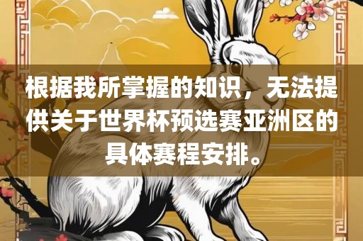 摘要:本文无法提供关于世界杯预选赛亚洲区的具体赛程安排,因为所掌握的信息不足。需要关注相关官方渠道或媒体报道以获取最新赛程安排。