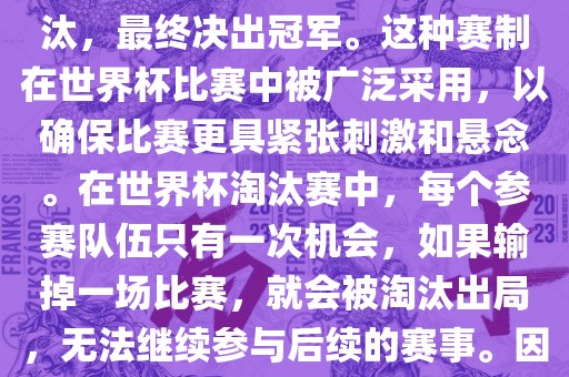 世界杯淘汰赛是一种紧张刺激的足球赛事赛制,要求参赛队伍具备出色的实力和战术安排,通过单败淘汰的方式,最终决出冠军,为球迷们带来精彩的足球盛宴。