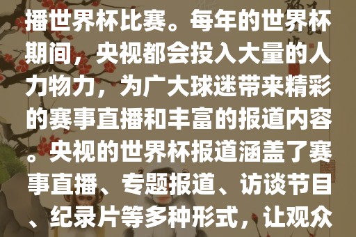 央视作为世界杯赛事的重要转播媒体,每年世界杯期间都会投入大量资源,为广大球迷带来精彩的赛事直播和丰富的报道。报道形式包括赛事直播、专题报道、访谈节目和纪录片等,让观众全面了解世界杯背后的故事和瞬间。