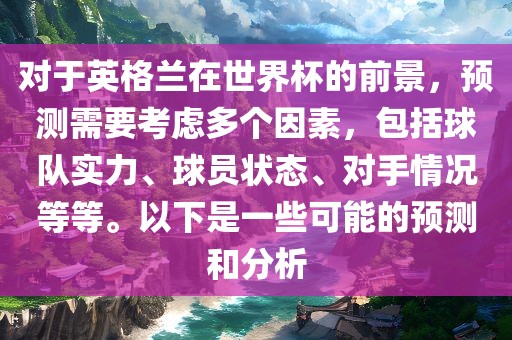 对于英格兰在世界杯的前景,预测需要考虑多个因素,包括球队实力、球员状态、对手情况等等。以下是一些可能的预测和分析