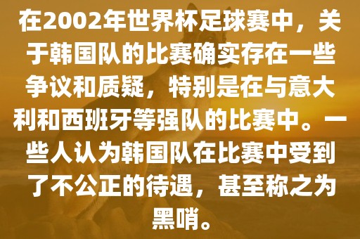 在2002年世界杯足球赛中,关于韩国队的比赛确实存在一些争议和质疑,特别是在与意大利和西班牙等强队的比赛中。一些人认为韩国队在比赛中受到了不公正的待遇,甚至称之为黑哨。