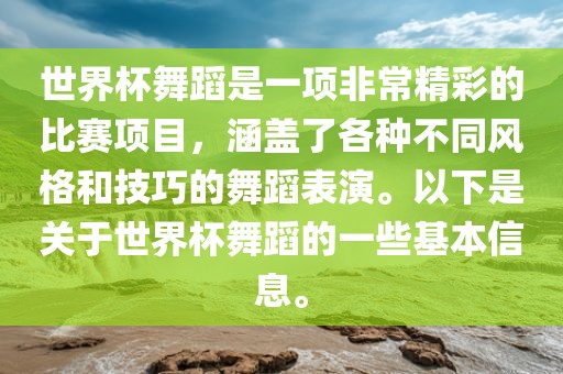 世界杯舞蹈是一项非常精彩的比赛项目,涵盖了各种不同风格和技巧的舞蹈表演。以下是关于世界杯舞蹈的一些基本信息。