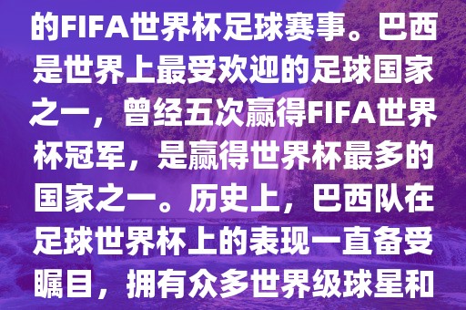 巴西足球世界杯是巴西举办的FIFA世界杯足球赛事,巴西是足球强国,曾五次夺得FIFA世界杯冠军。历史上,巴西队在足球世界杯上的表现备受瞩目,拥有众多世界级球星和经典比赛瞬间。此次赛事将呈现精彩纷呈的足球盛宴,吸引全球球迷的关注。