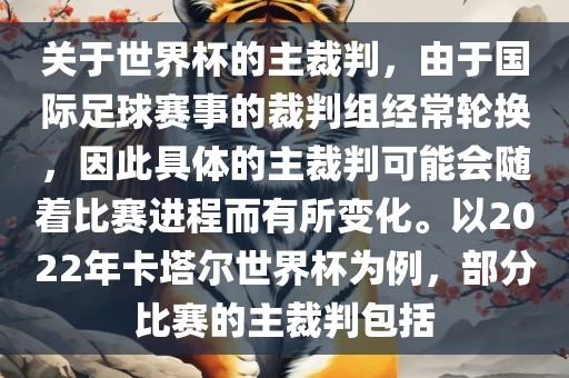 摘要:关于世界杯的主裁判,由于国际足球赛事的裁判组经常轮换,主裁判会随着比赛进程而变动。以2022年卡塔尔世界杯为例,部分比赛的主裁判包括多位经验丰富的国际知名裁判,他们将在比赛中发挥重要作用,确保比赛的公平、公正。具体主裁判名单随着赛事进展会有所变化。