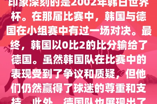 韩国和德国在世界杯足球赛中有过多次交锋。其中,最令人印象深刻的是2002年韩日世界杯。在那届比赛中,韩国与德国在小组赛中有过一场对决。最终,韩国以0比2的比分输给了德国。虽然韩国队在比赛中的表现受到了争议和质疑,但他们仍然赢得了球迷的尊重和支持。此外,德国队也展现出了强大的实力和战术素养,赢得了球迷们的赞赏。