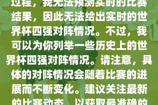 由于世界杯比赛是一个动态的过程,我无法预测实时的比赛结果,因此无法给出实时的世界杯四强对阵情况。不过,我可以为你列举一些历史上的世界杯四强对阵情况。请注意,具体的对阵情况会随着比赛的进展而不断变化。建议关注最新的比赛动态,以获取最准确的信息。