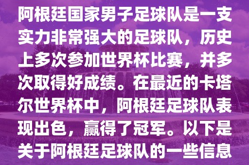 阿根廷国家男子足球队是一支实力强大的足球队,拥有辉煌的战绩和出色的球员,在未来的比赛中,相信阿根廷足球队将继续保持优秀的表现,为球迷们带来更多精彩的比赛和难忘的瞬间。