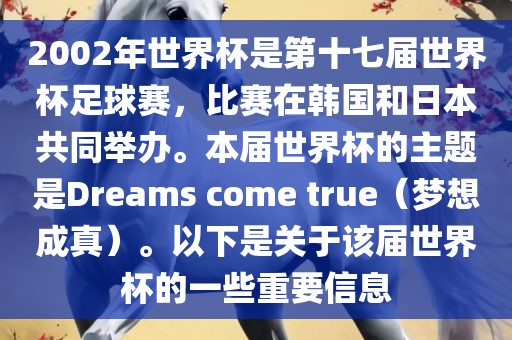 摘要:2002年世界杯足球赛是第十七届比赛,在韩国和日本共同举办,主题为Dreams come true。该届世界杯见证了众多精彩比赛和难忘的瞬间,同时也留下了许多重要信息,成为世界杯历史上的一个重要篇章。