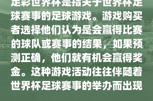 摘要:足彩世界杯是一种基于世界杯足球赛事的足球游戏,玩家通过预测比赛结果来参与游戏,有机会赢得奖金。这种游戏活动通常伴随着世界杯足球赛事的举办而出现,玩家可以选择他们认为会获胜的球队或赛事结果。