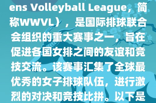 世界女排联赛(World Womens Volleyball League,简称WWVL),是国际排球联合会组织的重大赛事之一,旨在促进各国女排之间的友谊和竞技交流。该赛事汇集了全球最优秀的女子排球队伍,进行激烈的对决和竞技比拼。以下是关于世界杯女排赛的详细信息