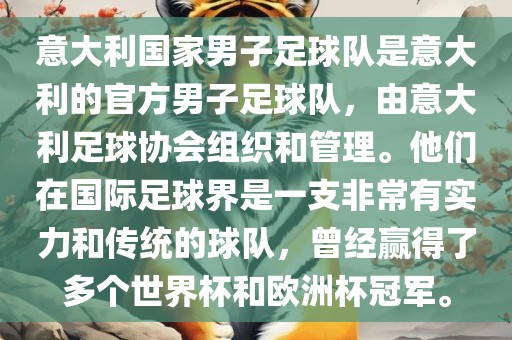 意大利国家男子足球队是一支充满传统和实力的球队,他们的表现令人瞩目,无论比赛结果如何,他们都会继续为球迷们带来激情和快乐。