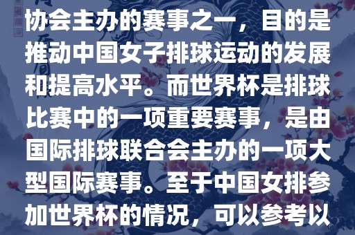 中国女子排球联赛是中国排球协会主办的赛事之一,目的是推动中国女子排球运动的发展和提高水平。而世界杯是排球比赛中的一项重要赛事,是由国际排球联合会主办的一项大型国际赛事。至于中国女排参加世界杯的情况,可以参考以下信息