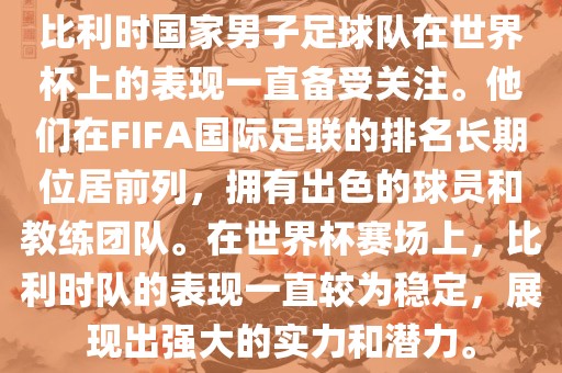 比利时国家男子足球队在世界杯上是一支备受关注的球队,他们拥有强大的实力和潜力,始终在比赛中展现出出色的表现,他们仍将是世界杯赛场上的重要竞争者之一。