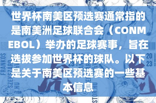 世界杯南美区预选赛通常指的是南美洲足球联合会(CONMEBOL)举办的足球赛事,旨在选拔参加世界杯的球队。以下是关于南美区预选赛的一些基本信息