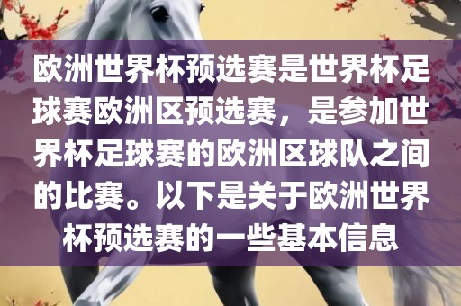 欧洲世界杯预选赛是参加世界杯足球赛的欧洲区球队之间的比赛,对于参加世界杯的欧洲足球队来说具有重要意义,通过预选赛,各队可以锻炼实力、积累经验,为参加世界杯做好准备。