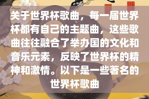 摘要:世界杯歌曲是每一届世界杯不可或缺的元素,融合了举办国的文化和音乐元素,反映了世界杯的精神和激情。这些歌曲以其独特的旋律和富有感染力的歌词,成为世界杯的经典之作。从历届世界杯中,我们可以听到一些著名的歌曲,它们见证了世界杯的历史,也成为了球迷们心中的永恒回忆。