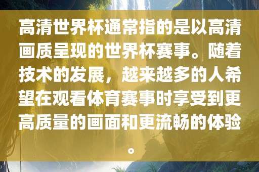 高清世界杯通常指的是以高清画质呈现的世界杯赛事。随着技术的发展,越来越多的人希望在观看体育赛事时享受到更高质量的画面和更流畅的体验。